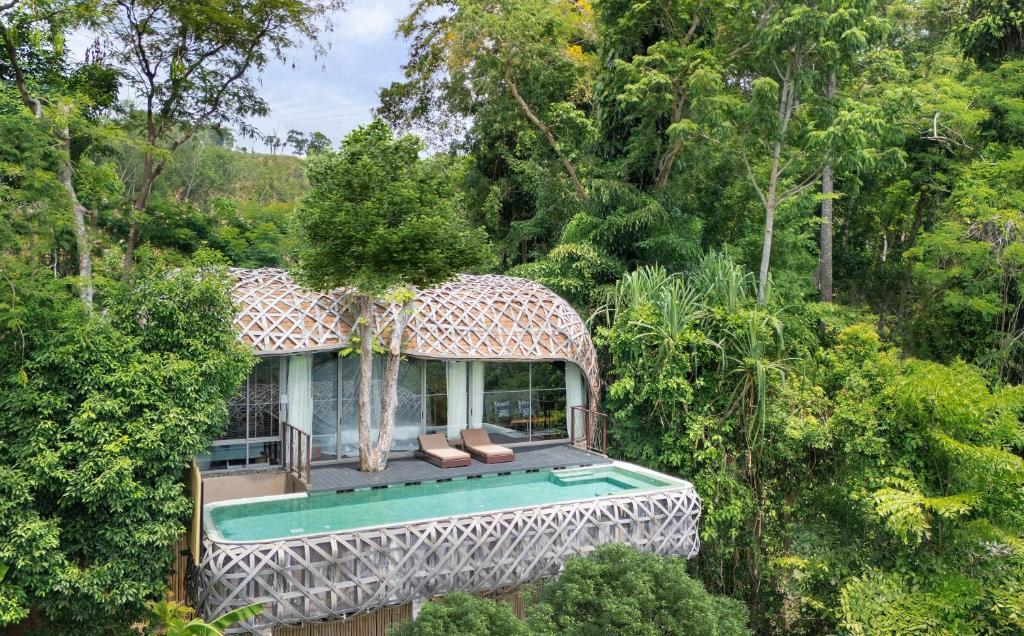 独立别墅的设计灵感源自部落居所:“帐篷泳池别墅”受雨林游牧民族启发,拥有穹顶屋顶和高架椭圆形浴缸;“树屋泳池别墅”则体现了韦哈(We-ha)天族的文化特色,采用双层结构和悬空家具;“陶土泳池小屋”则呼应了传统的泰国茅草屋。 “鸟巢别墅”宛如编织的木玻璃鸟笼,可俯瞰大海与森林。